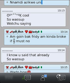 like seriously? dis world don spoil finish sha. this age of bb, twitter and facebook , hmmmm. the girl get sense small sha. she did not spill her twitter handle and her facebook name. dis is what goes on in our universities. God would surely help. it wnt surprise me sha if the guy chatting is a married man.