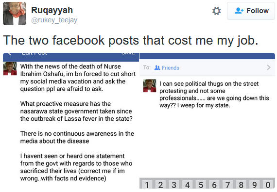 Ruqayyat was unfairly sacked because she expressed her freedom of speech by asking the Nasarawa State government some pertinent questions on social media. She was sacked a few days after she made these comments...